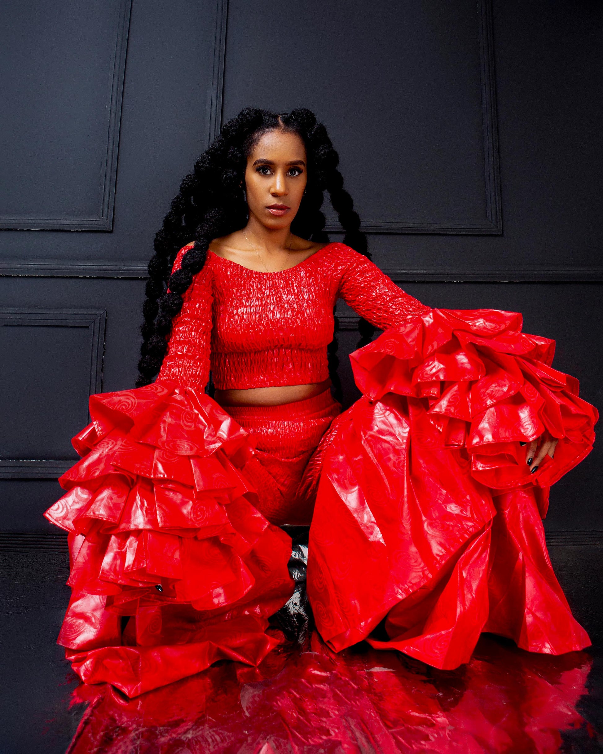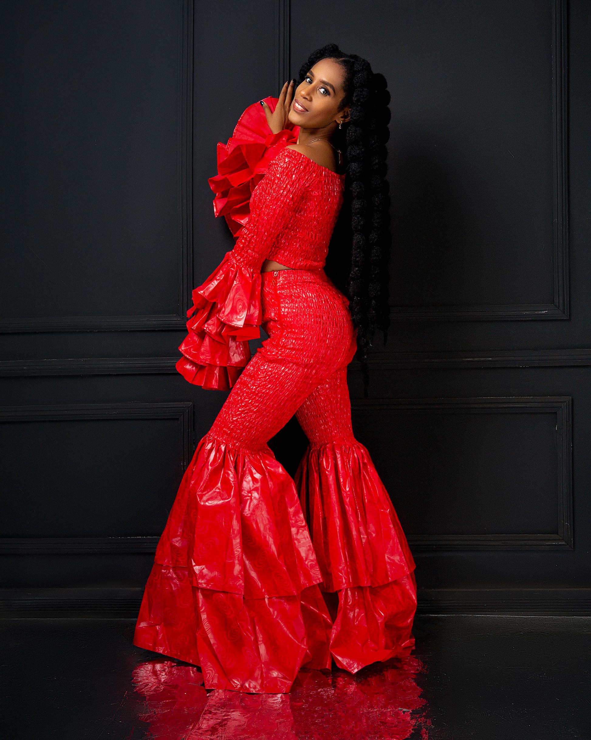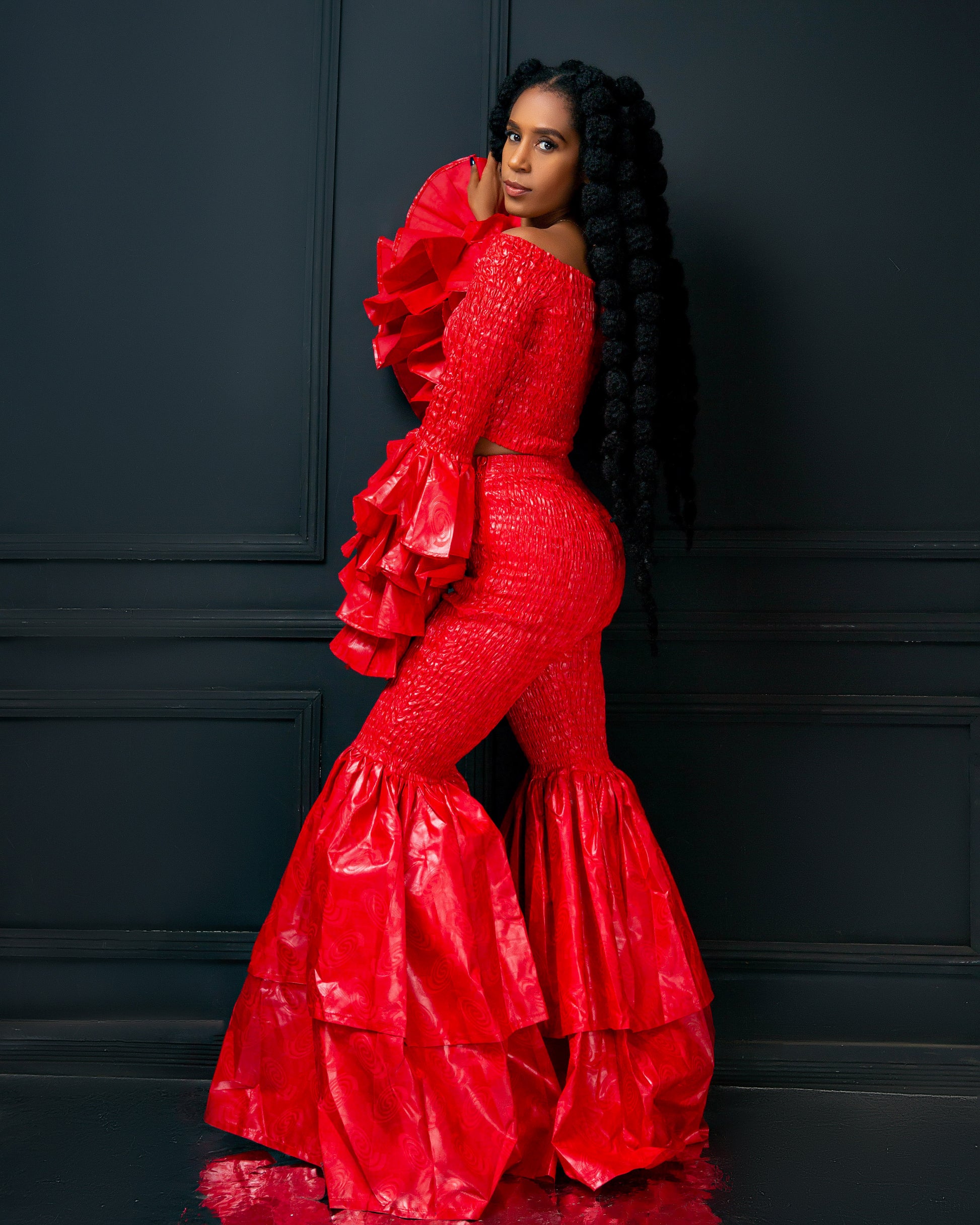 The bold red color of the fabric brings out your personality, while the dramatic bell bottom silhouette adds a touch of retro flair that's always in style.
